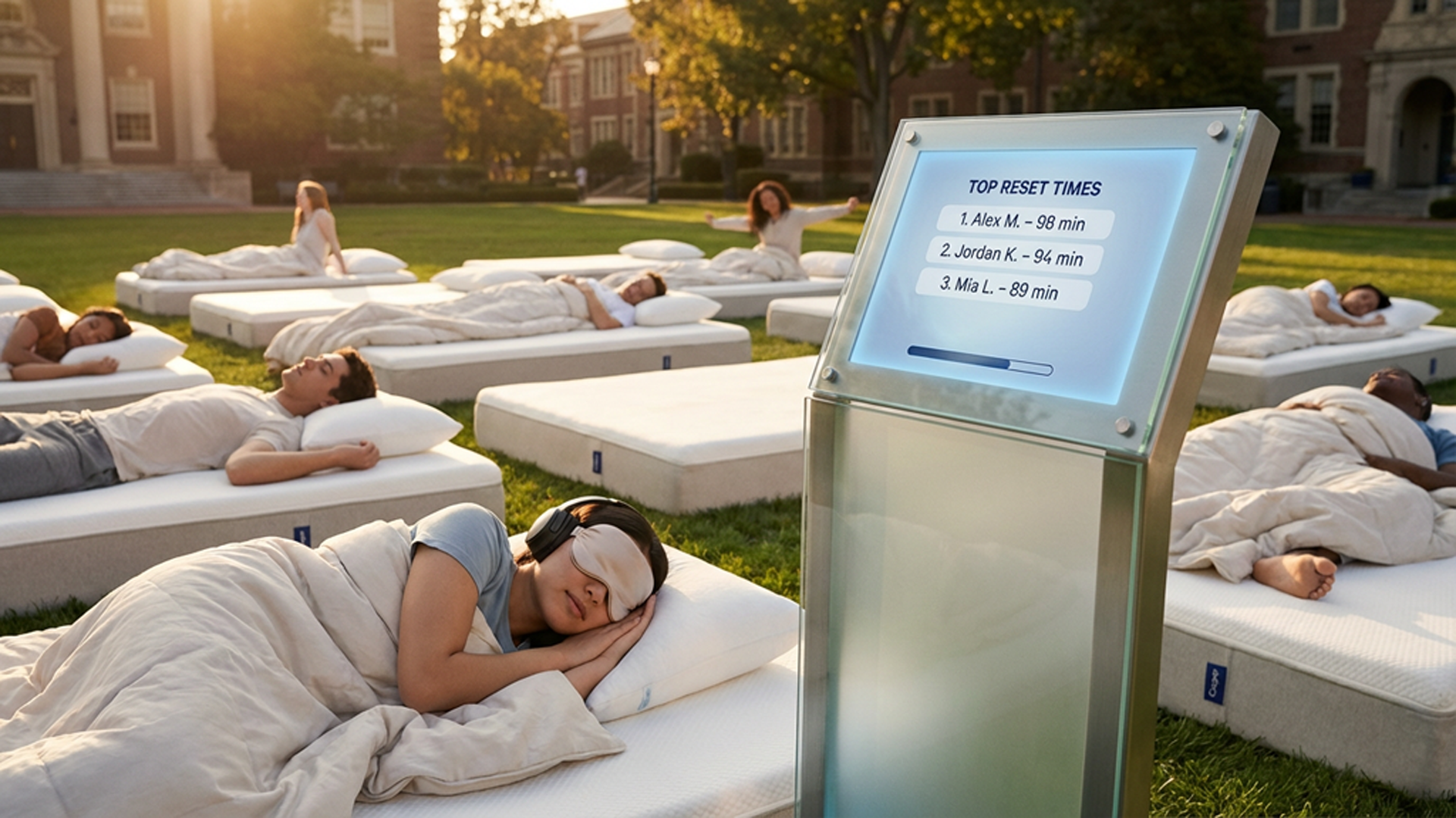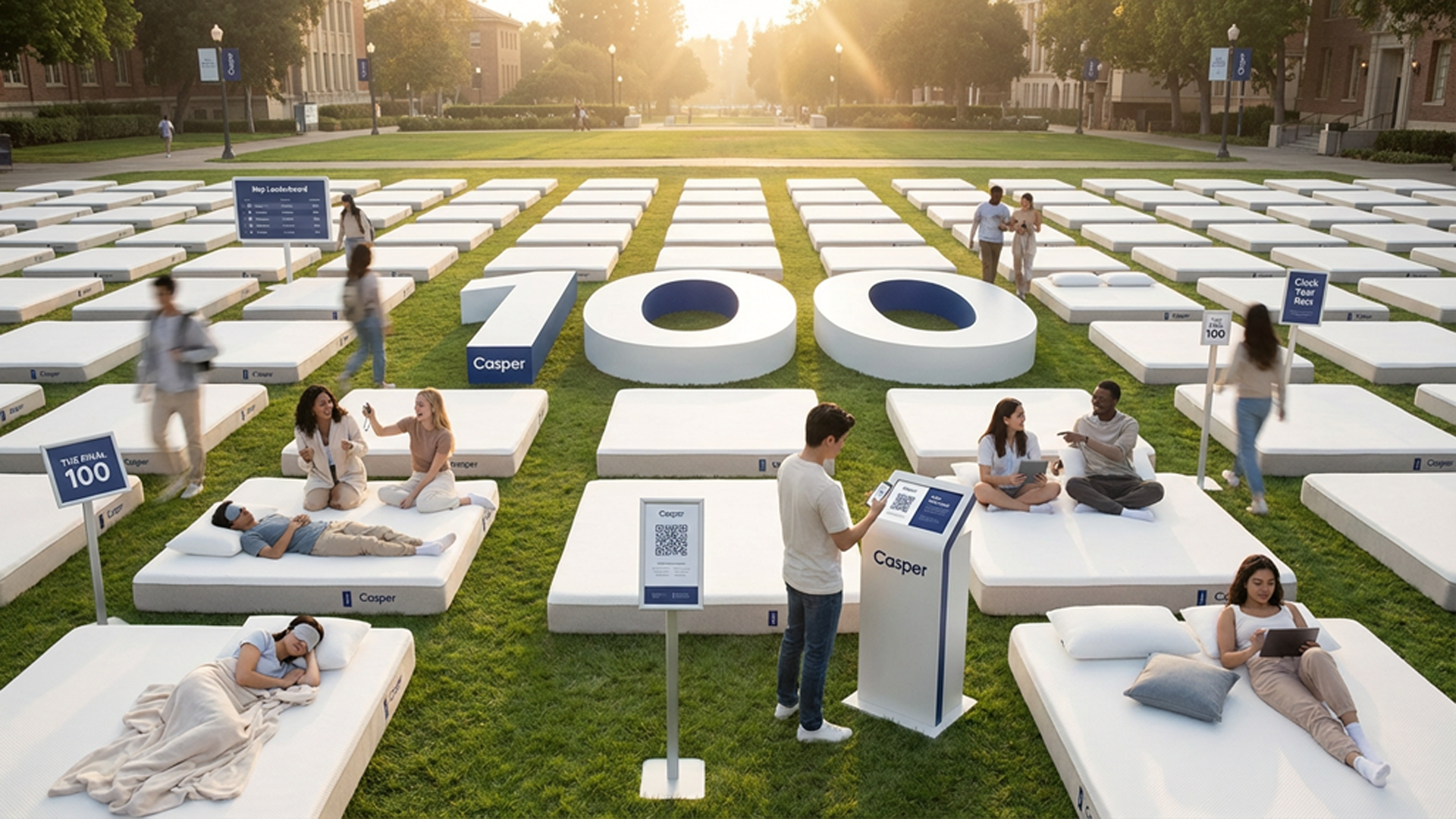 100 nights before graduation, Casper takes over Big Ten campuses—transforming quads into grids of Casper mattresses. Students are invited to rest between classes, take on sleep challenges, and experience Casper comfort during one of the most stressful stretches of their lives.